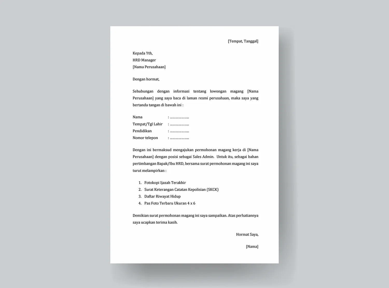 Surat lamaran magang adalah dokumen yang penting dalam proses mengajukan diri sebagai kandidat magang di suatu perusahaan atau instansi pemerintahan. Berikut struktur surat lamaran magang yang harus Anda cantumkan di dalamnya, yaitu: