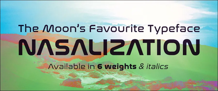 Font pertama adalah Nasalization. Font ini terinspirasi dari logo NASA pada tahun 1975, dengan desain yang halus dan modern. Cocok digunakan untuk desain-desain yang membutuhkan kesan futuristik dan kontemporer, seperti desain web atau poster.