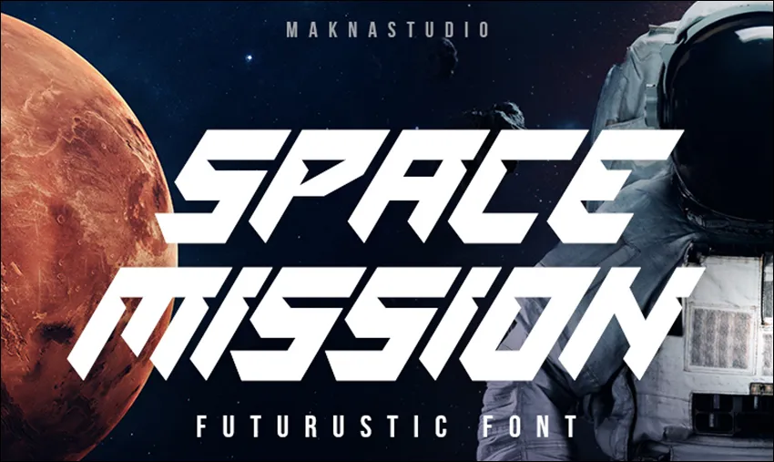 Font spasi, atau font kosmik, adalah jenis font yang terinspirasi dari elemen-elemen luar angkasa. Font spasi sangat populer dengan bentuk geometris dan desainnya yang unik dan tidak konvensional, menyerupai teknologi masa depan. Penggunaan font spasi pun tidak hanya terbatas pada desain cetak, tapi juga sangat cocok digunakan dalam proyek-proyek desain digital, seperti desain web, desain game, presentasi, grafis media sosial, dan masih banyak lagi.