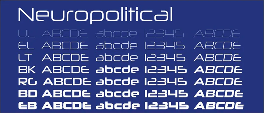 Font kedua adalah Neuropolitical. Karakter dalam font ini memiliki bentuk yang futuristik dan dinamis, dengan detail yang halus namun tetap terlihat jelas. Cocok digunakan untuk desain-desain yang ingin menyampaikan pesan modern atau teknologi, seperti logo perusahaan teknologi atau judul game, dan lain-lain.