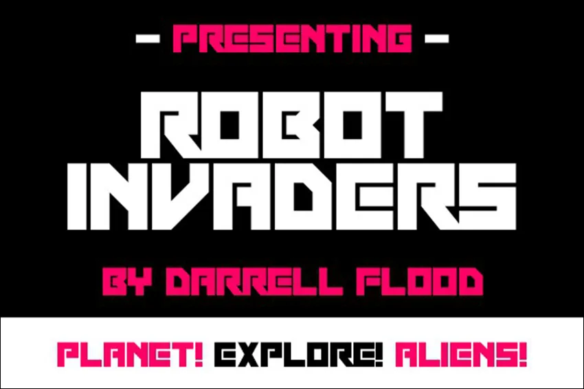 Robot Invaders terinspirasi dari estetika robotik dan futuristik, dengan karakter-karakter yang bold. Cocok digunakan untuk desain-desain game atau merchandise.