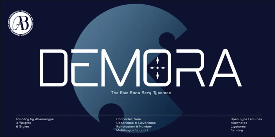 Demora memiliki karakter yang elegan dan halus, dengan penggunaan garis-garis yang mengalir dengan indah. Cocok digunakan untuk desain-desain yang ingin menampilkan kesan keanggunan dan kelembutan, seperti dalam pembuatan kartu undangan atau desain logo perusahaan fashion.