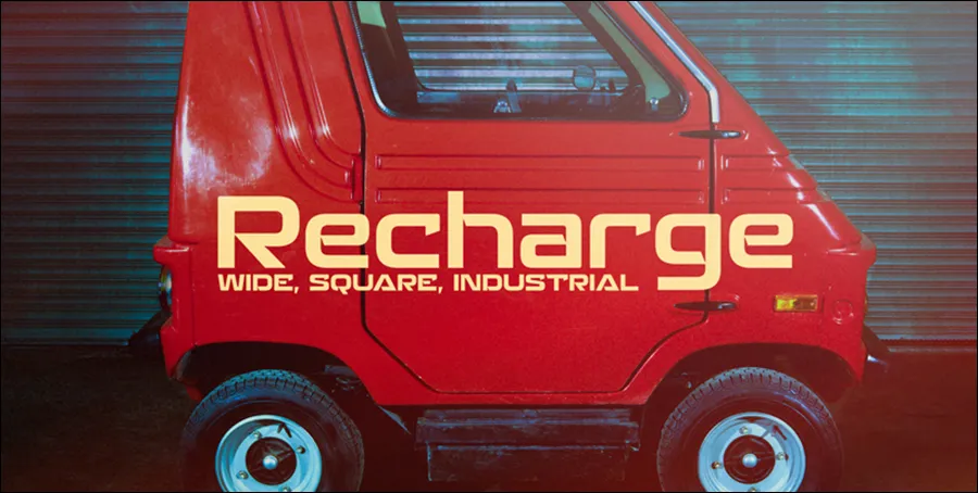 Recharge menampilkan desain persegi yang lebar dan modern, dengan detail yang halus dan mengalir. Cocok digunakan untuk desain-desain pembuatan poster atau cover album musik.