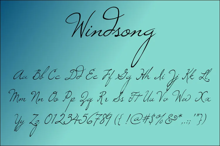 Windsong adalah font yang menghadirkan nuansa alami dan santai. Dengan desain yang mengalir seperti tulisan tangan, font ini cocok digunakan untuk undangan-acara yang berlangsung di luar ruangan atau dengan tema alam.