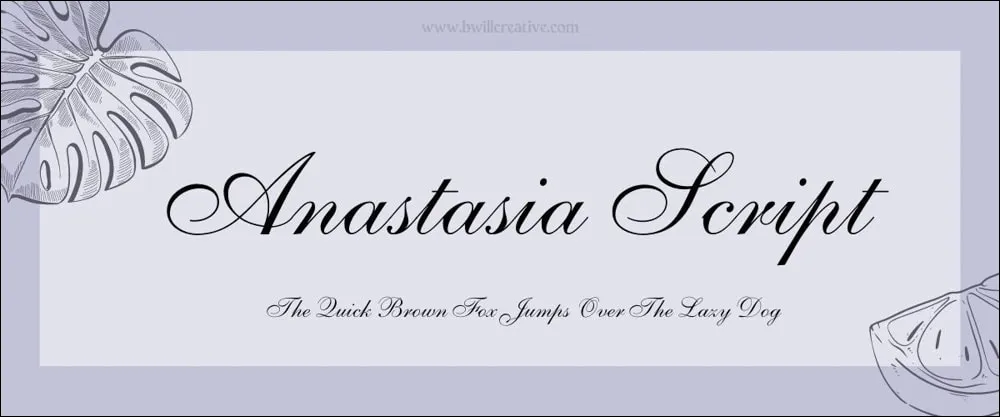 Anastasia Script adalah font yang memiliki gaya yang anggun dan romantis. Cocok digunakan untuk undangan pernikahan atau acara khusus lainnya yang ingin menampilkan sentuhan kelembutan.